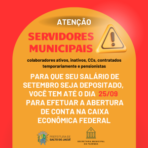 A Secretaria Municipal da Fazenda comunica que os servidores municipais ativos, inativos, CCs, contratados temporariamente ou pensionistas PRECISAM abrir conta na Caixa Econômica Federal, até o dia 25/09, para que o depósito do salário de setembro seja efetuado.