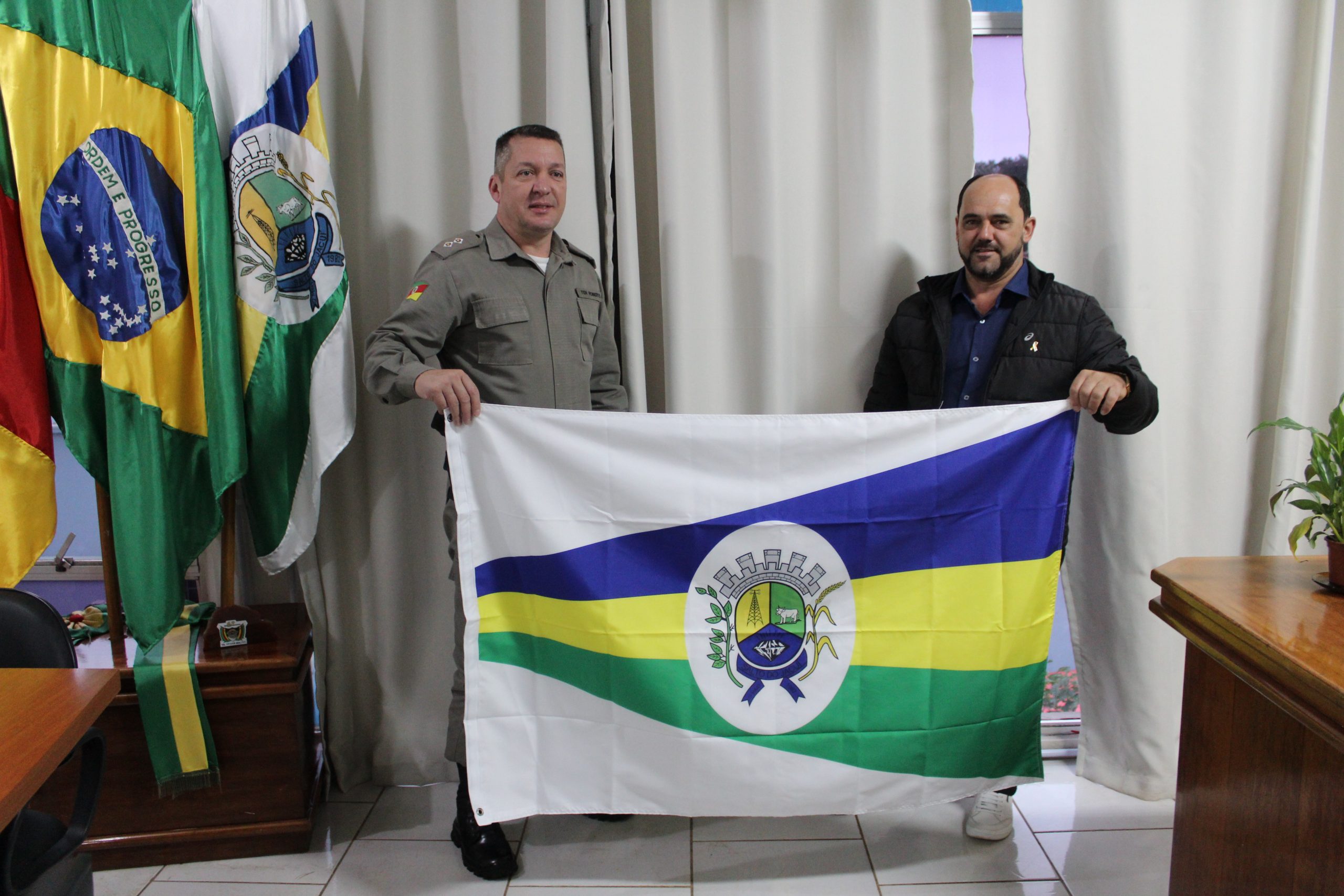O prefeito Ronaldo Moraes fez a entrega de uma bandeira do Município ao comandante da Brigada Militar de Salto do Jacuí, tenente Paulo Roberto dos Santos, na manhã de hoje. A Brigada Militar utilizará a bandeira do Município para hasteá-la em frente ao prédio da Brigada, juntamente das bandeiras do Brasil e do Rio Grande […]
