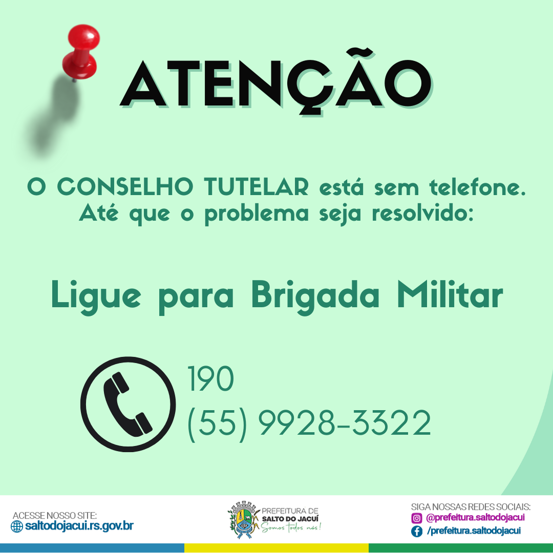 Avisamos que o Conselho Tutelar está temporariamente sem telefone. Caso necessite de assistência, por favor, entre em contato com a Brigada Militar. Agradecemos a compreensão.