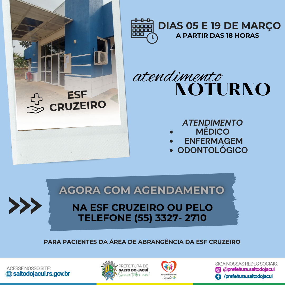 ➡Atendimento noturno Agende seu horário 👉Somente para pacientes da área de abrangência da ESF Cruzeiro Comunicação/Prefeitura de Salto do Jacuí
