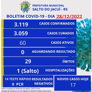 29 de dezembro de 2022 - em CORONAVIRUS – BOLETINS EPIDEMIOLÓGICOS‚ COVID-19‚ Notícias Por imprensa Comment off Boletim COVID-19 DIA 28/12/2022 Anterior Homologação Preliminar Inscrições PSS 09-2022 Próximo Boletim COVID-19, dia 29/12