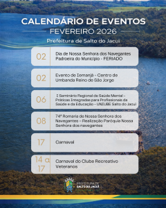 30 de janeiro de 2026 - em Notícias‚ Publicações Por imprensa Comment off Calendário de Eventos Fevereiro de 2026 Confira o calendário de eventos do mês de fevereiro e fique por dentro de tudo que acontece em nosso município. Anterior Edital de Audiência Pública, Nº 003/2026 RDQA – 2º Quadrimestre de 2025 Próximo Alistamento Militar 2026