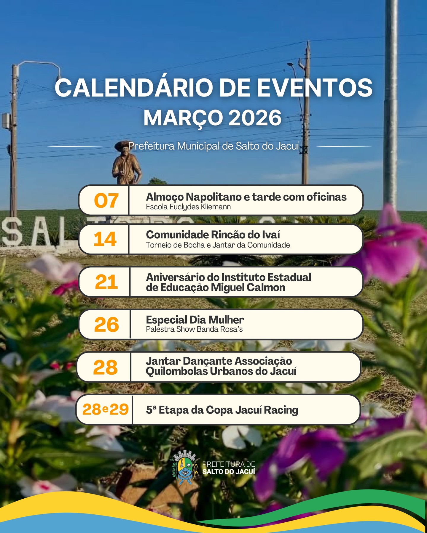 6 de março de 2026 - em Notícias‚ Publicações Por imprensa Comment off Calendário de Eventos Março de 2026 Março chegou trazendo eventos importantes e muito especiais! Confira o calendário do mês e fique por dentro de tudo o que acontece em Salto do Jacuí. Comunicação/Prefeitura Municipal de Salto do Jacuí. Anterior Próximo Secretaria da Agricultura Realiza Patrolamento nas Estradas do Município