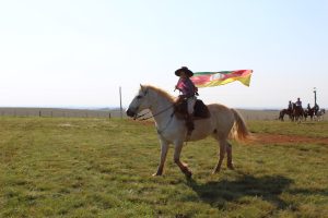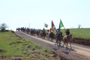 A cavalgada partiu da parte central da comunidade e seguiu o caminho até a propriedade do tradicionalista Paulo Mello, um veterano de 87 anos que, infelizmente, não pôde montar junto com os demais, mas cujo espírito continuou a guiar a jornada. Seu Paulo recebei homenagens com poesia e música e o carinho e respeito dos cavaleiros.