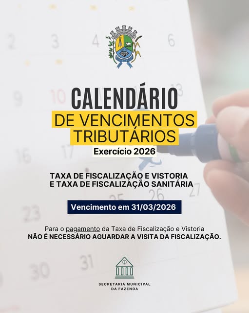 Calendário de Vencimentos Tributários – Exercício 2026. Taxa de Fiscalização e Vistoria e Taxa de Fiscalização Sanitária: Vencimento em 31/03/2026. Imposto Sobre Serviços ISS: Pessoas físicas (profissionais autônomos): 1ª Parcela ou cota única 31/03/2026 Última parcela 30/06/2026. Pessoas jurídicas (ISS variável): 1º Vencimento: 20/02/2026. Vencimento entre os 18 e 20 de cada mês. Fique atento […]