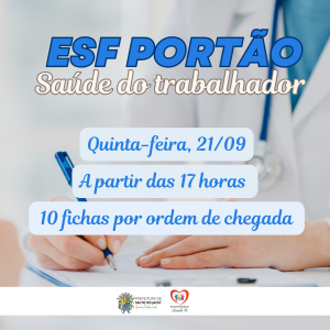 O ESF Portão irá realizar atendimento noturno, na quinta-feira (21/09), a partir das 17 horas. Serão distribuídas 10 fichas por ordem de chegada. A ação visa atender trabalhadores que não tem acesso ao serviço no horário normal de expediente.