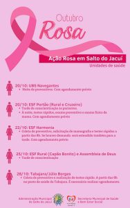 A Secretaria Municipal de Saúde de Salto do Jacuí montou um calendário e está disponibilizando serviços para que todas as mulheres realizem seus exames e cuidem de sua saúde. A ação é realizada em alusão ao “Outubro Rosa”, campanha de preservação e conscientização do câncer de mama e do colo uterino.