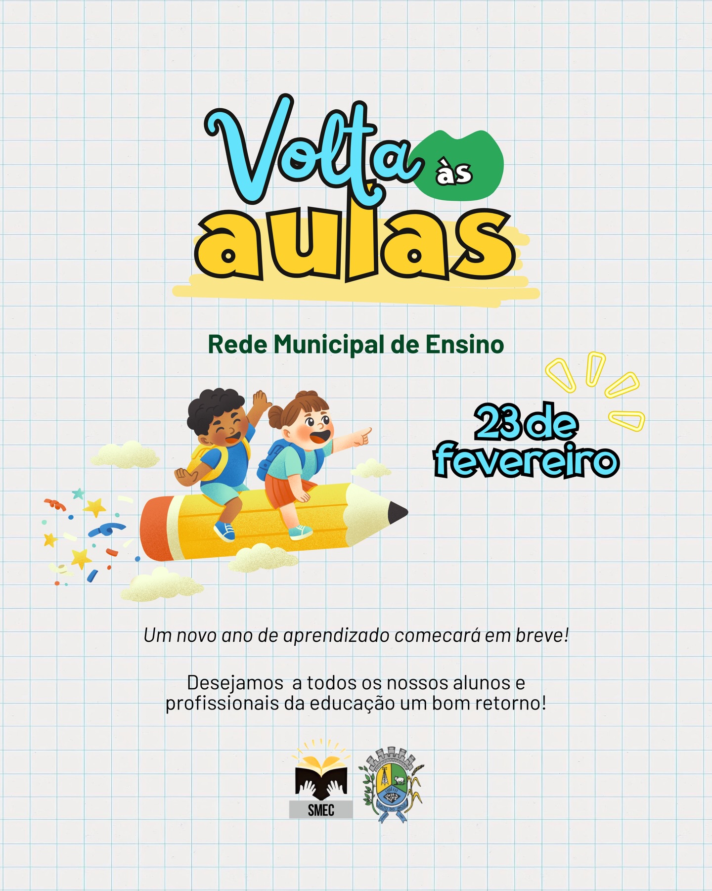 A rede municipal de ensino está pronta para o início do ano letivo 2026. Desde já, desejamos um bom retorno para alunos, professores e todos os profissionais envolvidos na educação de nossas crianças.